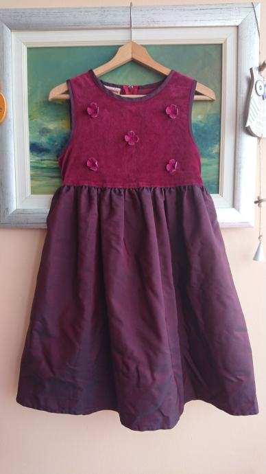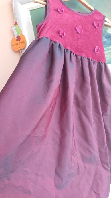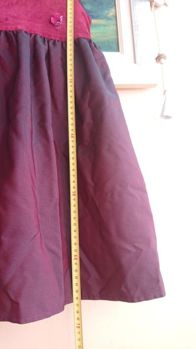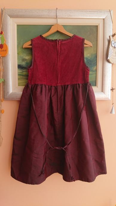 Tamno crvena haljina br. 110 za curice, dužina cca 66cm, sa 3D cvjetićima naprijed, kopčanje otraga na cif, otraga se veže i mašnica.