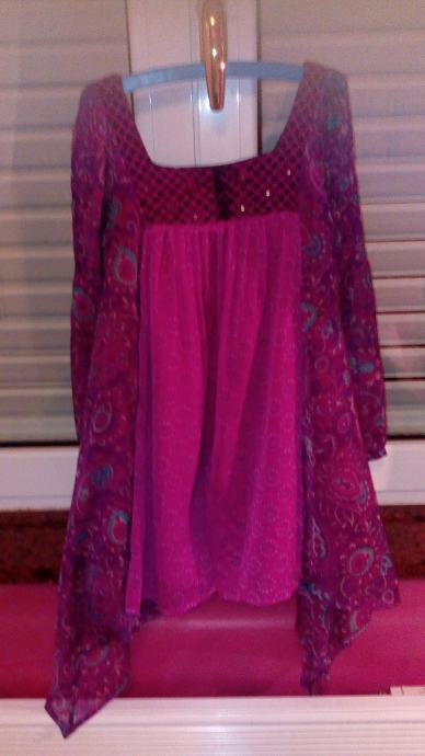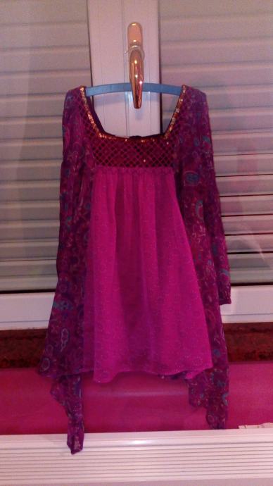 PRODAJEM TUNIKU 9-10 god., MONSOON, VIŠE NIJANSI/DEZENA LJUBIČASTE BOJE, UKRAŠENA PERLICAMA, S UKRASNIM KOPČANJEM ODOZADA, VRLO LIJEPA, ELEGANTNA I VESELA, U IZVRSNOM STANJU.