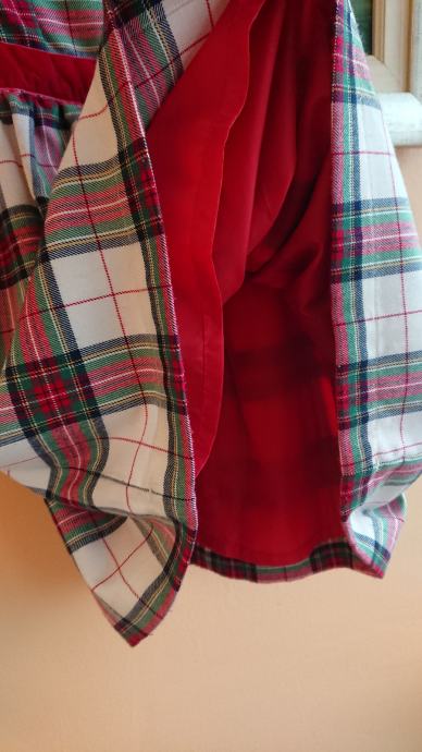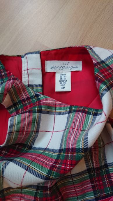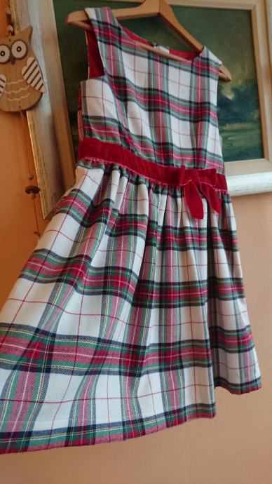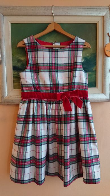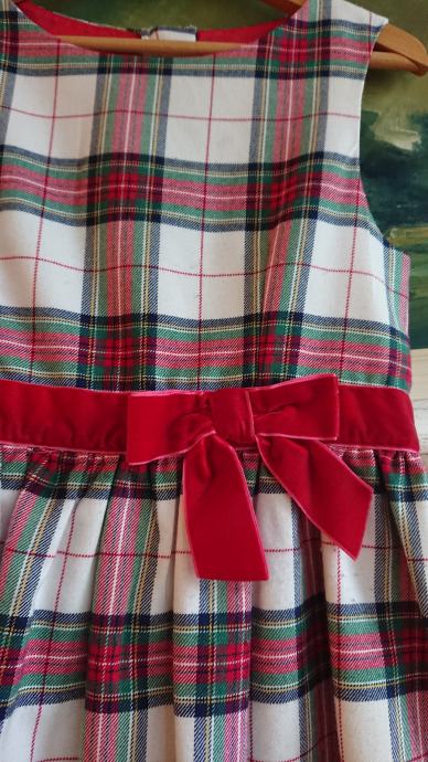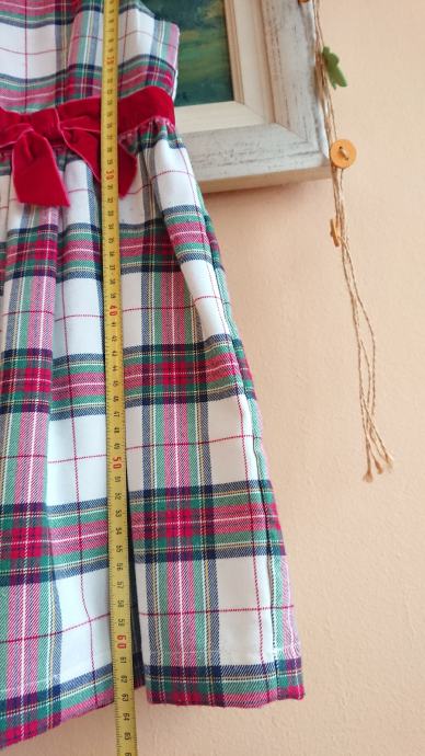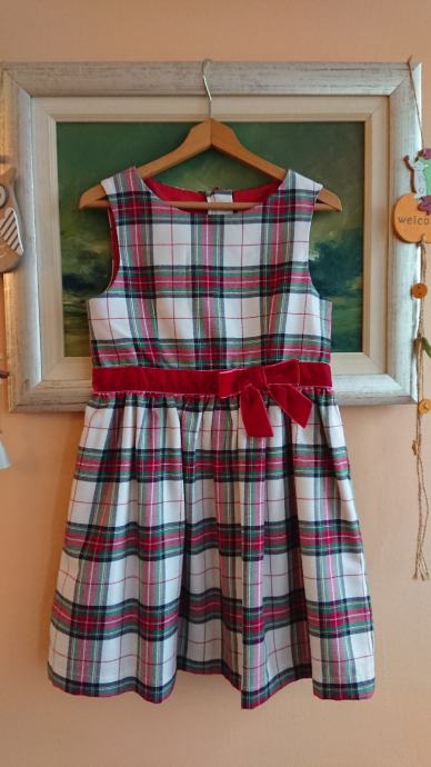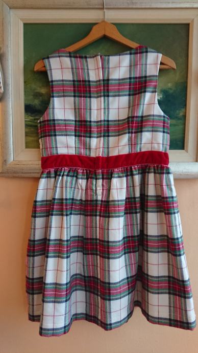 Zimska haljina 122 za djevojčice, na njoj piše 128, no po meni je idealna za 116 i 122, dužina cca 63cm, preslatka božićna karirana haljinica, nosiva cijelu zimu, ima laganu podstavu i crvenu mašnu naprijed, kopčanje otraga na cif, nošena, stanje vidljivo na slikama.