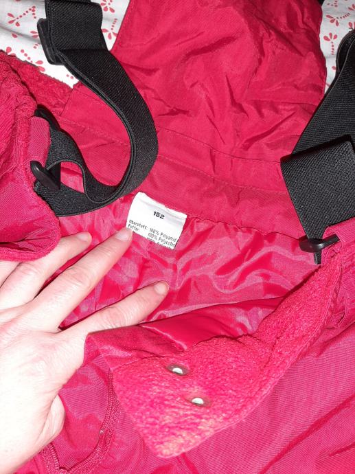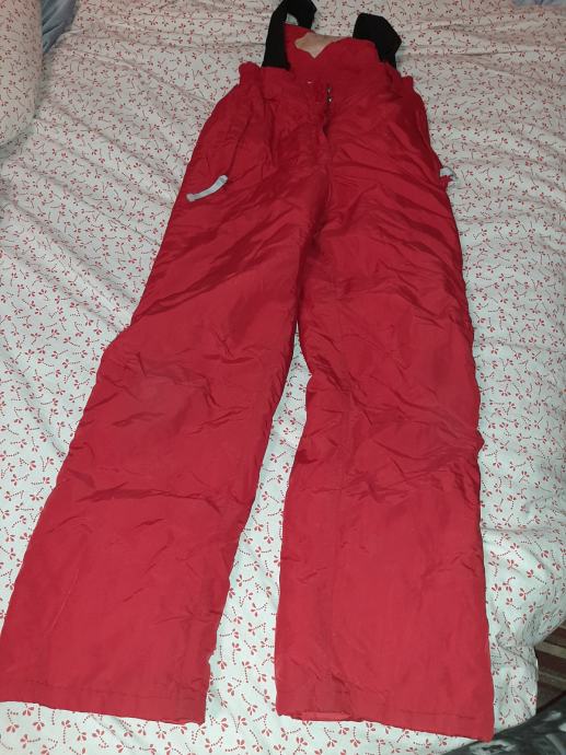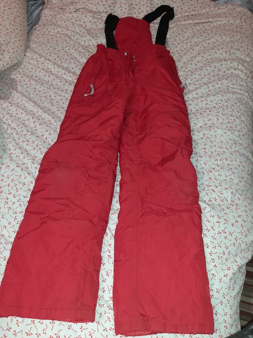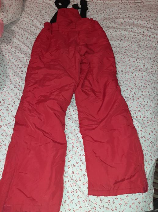 Dječje ski hlače- tregerice. Nošene jednu zimu, bez oštećenja, očuvane. Vel. 152. Dužina nogavice mjereno od vrha pasice do dolje 100cm, međunožje 65cm, širina pasice bez natezanja 33cm.