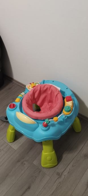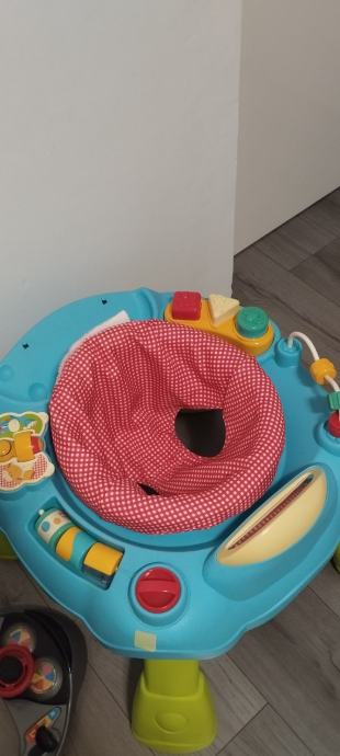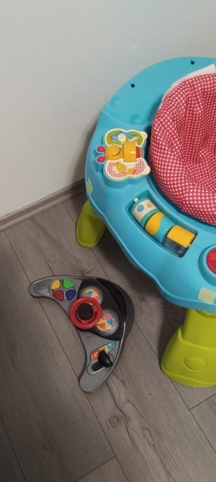 Ima dvije visine nogu.+6mj.Dijete uči stajat ,okretat se, opirat se nogicama.Nemam dio što je bio od iza ali imam drugi koji je odvojen.Radi na baterije...Na stolcu ima raznih zanimljivih igra.očuvano