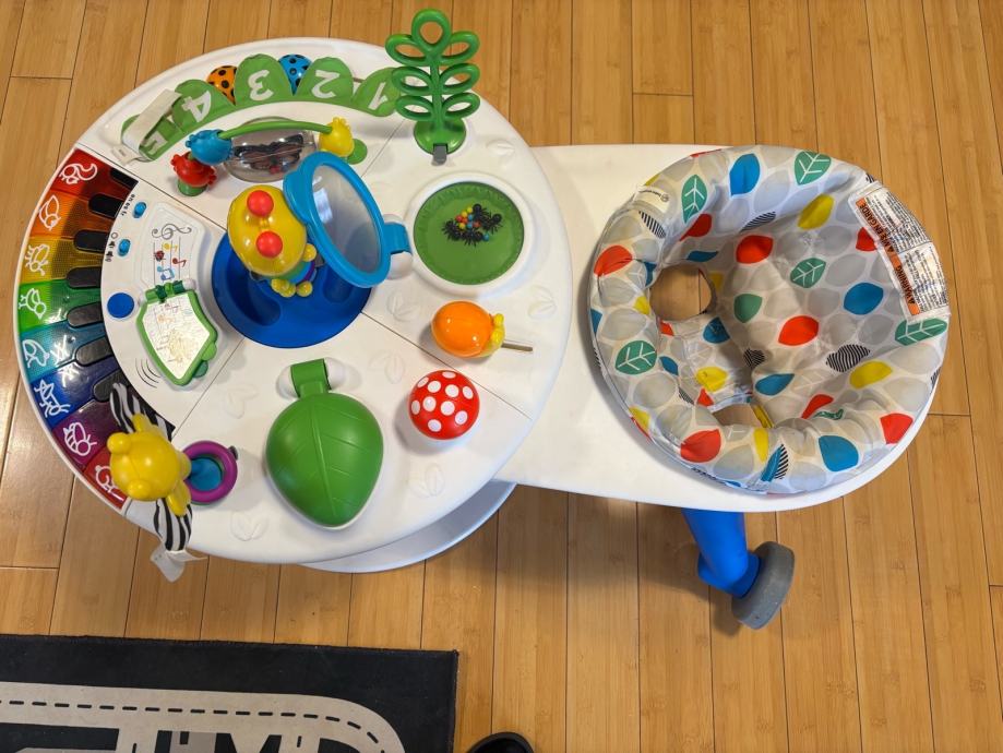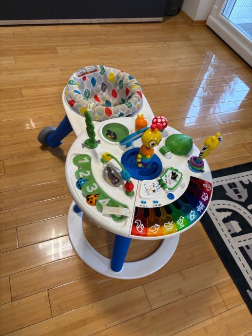 Mekano sjedalo okreće se za 360 ° oko stola s aktivnostima, podupirući prve korake djeteta i omogućuje da dijete istražuje vlastitim tempom. Petnaest igračaka pruža senzorna iskustva na dohvat ruke djeteta i potiče razvoj motoričkih sposobnosti. Otkrijte nove zvukove i jezike uz klavir koji reproducira glazbu, zvukove životinje i boje na engleskom, španjolskom i francuskom jezik.