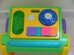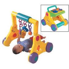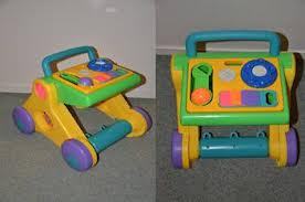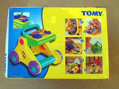 Tomy guralica – oslonac bebi kad uči hodati. Ima gore razne igračke. (šuškalica, ogledalo koje se vrti…) Ispod toga su oblici koji se mogu stavljati… Kad je beba manja može se staviti na bilo koju podlogu i beba se stavi ispod i može se igrati igračkama koje vise i koje su bočno. U principu se na kuke gore može objesiti koja god igračka… Sve je od plastike pa je lako perivo.