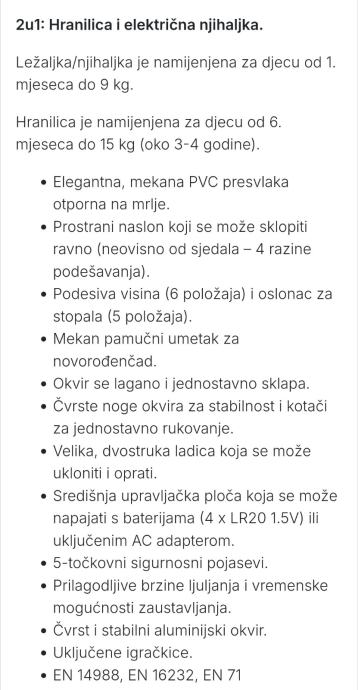 Korištena ali odlično očuvana, neki dijelovi uopće nisu korišteni. Odlična, udobna i stabilna hranilica, te savršena njihaljka za uspavljivanje sa visećim igračkicama i prekrasnim melodijama