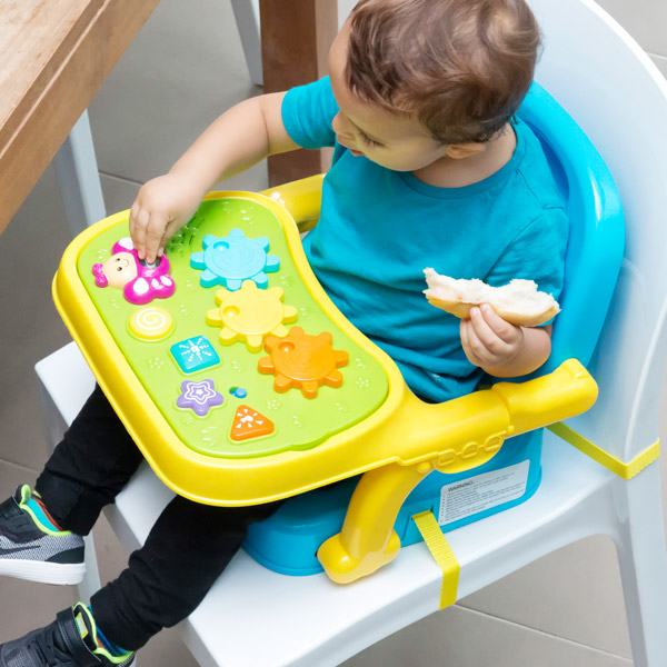 Ako ste u potrazi za nečim zabavnim i praktičnim za svoju bebu, Hranilica za bebe s pladnjem za igranje, svjetlom i zvukom upravo je ono što tražite! Veoma je praktična, s obzirom na to da se može koristiti i kao hranilica i kao edukativna igračka.Izrađena od plastikeOdvojivi pladanj za igranje (radi na baterije: 2 x AA, priložene)Odvojivi naslon za ruke i leđaRotirajući zupčanici i svjetleći gumbiVesele melodije i zvukoviIzdržljivi sigurnosni pojas i trake za pričvršćivanje na stolicuJednostavno čišćenje, montaža i transportPreporučena dob: +6 mjeseci i do 3 godineMaksimalna nosivost: 15 kgDva podesiva položaja visinePribližne dimenzije: 34 x 33/37 x 40 cm