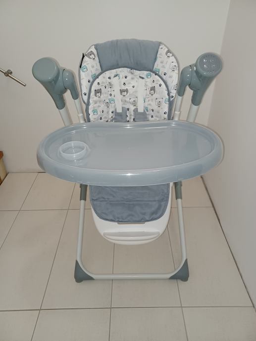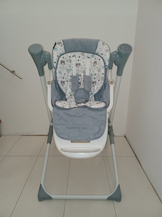 Sigurnosni pojas u 5 točaka, namještanje visine na 6 razina, 3 pozicije oslonca za noge, 4 pozicije namještanja naslona, dvostruki pladanj (gornji odvojiv), utor za bočicu, luk sa igračkama, periva navlaka na skidanje, siva boja.