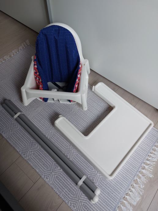 Prodajem očuvanu Ikea hranilicu za bebe (korištena povremeno kod bake i djeda) bez ikakvih oštećenja, sa potpornim jastukom, za bolju udobnost. Jastuk je na napuhavanje, a navlaka na patent ima 2 lica i periva je u perilici. Noge se mogu skinuti, kao i pladanj, što omogućava da se lako prenosi i ponovo sastavi.