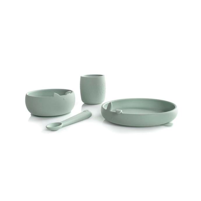 Zabavan, praktičan silikonski set za jelo od 4 dijela. Žlica je ergonomskog oblika, a silikonska čašica ne klizi i prilagođava se bebinim rukama i pomaže joj u učenju držanja i pijenja.