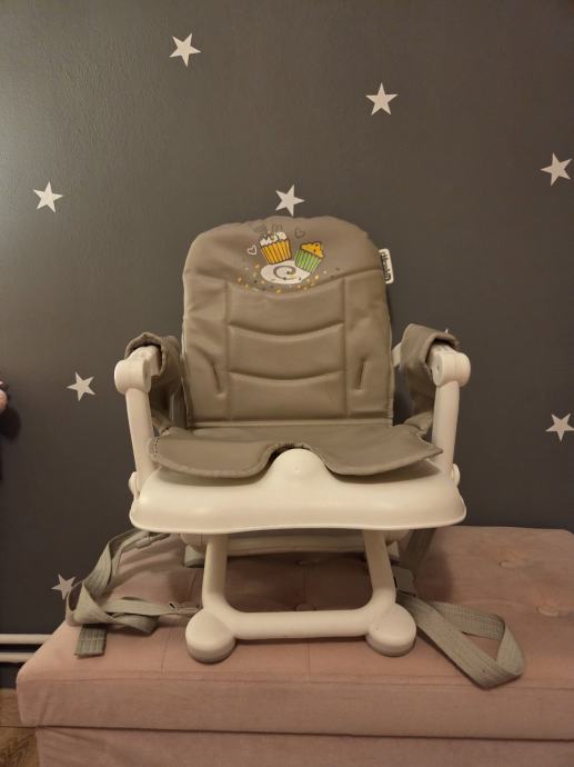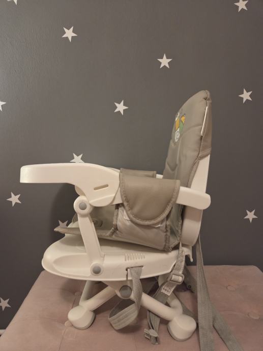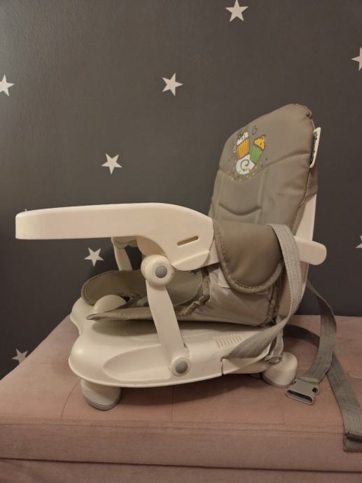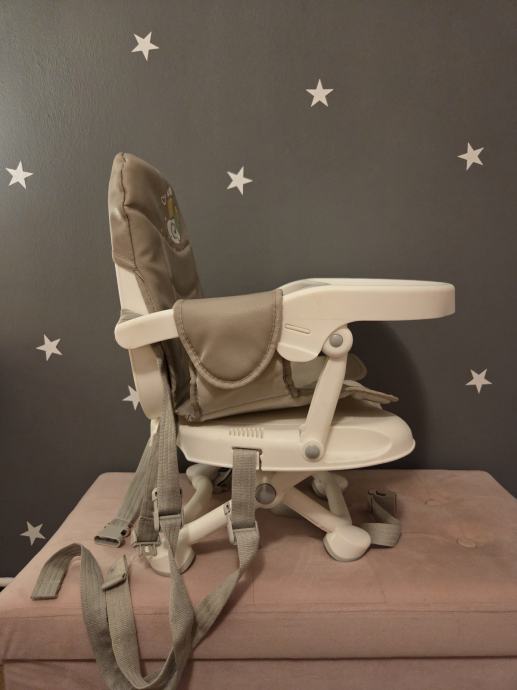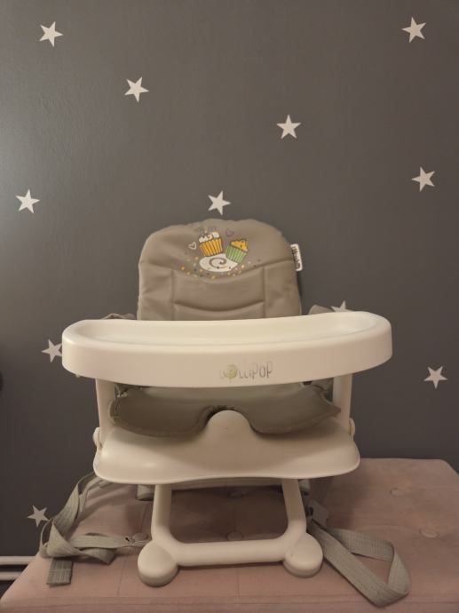 Prodajem prijenosnu hranilicu / booster stolicu Chipolino Lollipop u sivoj boji (taupe/grey). Idealna za hranjenje djece koja mogu samostalno sjediti, savršena za putovanja ili male kuhinje jer se kompaktno sklapa. Podesiva je po visini u 3 položaja, s 5-točnim sigurnosnim pojasom i protukliznim nogama za maksimalnu stabilnost. Maksimalna težina djeteta 15 kg, od dobi kada dijete sjedi samo (oko 6 mjeseci); lako se čisti, navlaka se skida. Kompaktna i lagana za nošenje.
