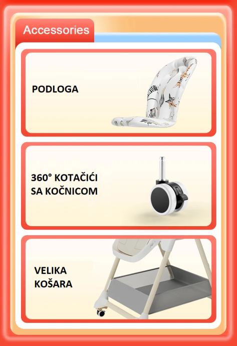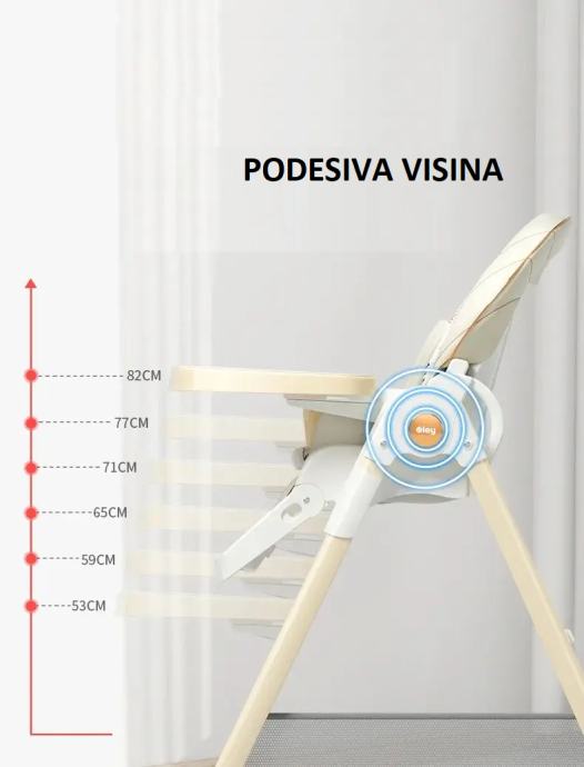 Funkcionalna: na stolici se lako podesi željena visina, pojedini dijelovi stolice su odvojivi za lakše čišćenje, sklopiva je i prenosiva