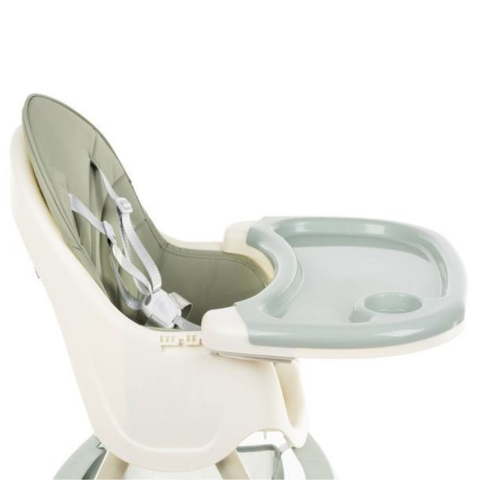 Stolica dolazi s pladnjem koji se može postaviti na stol, savršeno prilagođen za obroke i igru. Pladanj ima udubljenje za šalicu ili bocu, otporan je na temperature od -20 do 100°C i lako se čisti. Ovo znači da možete bez brige servirati sve, od hladnog sladoleda do toplog mlijeka.