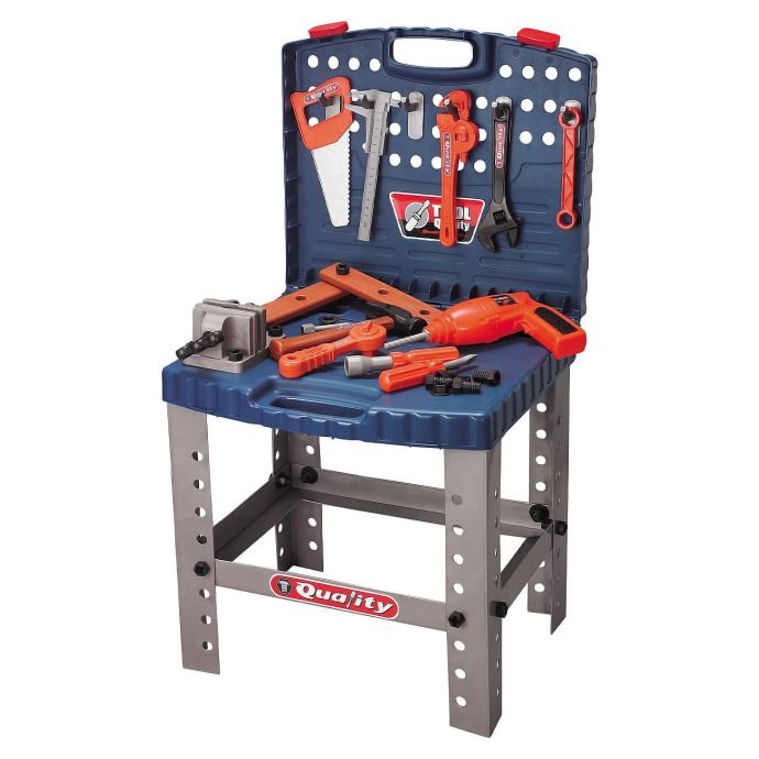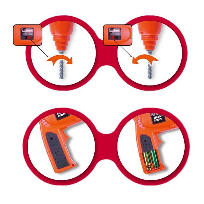 Ovo je savršen poklon za malog DIY entuzijasta i pružit će bezbroj sati sjajne i zanimljive zabave. Vrlo kvalitetan alat izrađen s realističnom reprodukcijom. Zahvaljujući ovoj divnoj igrački, svaki DIY entuzijast moći će odigrati ulogu tatinog majstora i pomagača. Za još zanimljiviju zabavu, odvijač radi na baterije. Dijete ga može koristiti za zavrtanje vijaka koji se nalaze u setu. Set se sklapa u praktičan kovčeg, što djetetu omogućuje da svoju omiljenu igračku nosi sa sobom gdje god želi. Rasklapanje kovčega je jednostavno • samo okrenite jedan od dijelova kovčega za 180 stupnjeva, a zatim ih pričvrstite nogicama i vijcima koji se nalaze u setu.