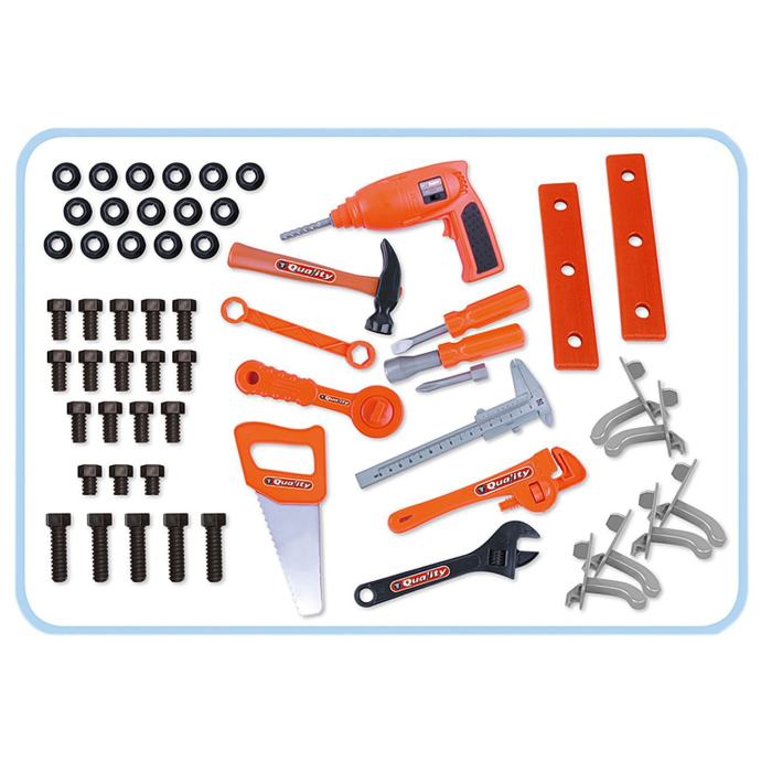 • U setu: vijci i matice, čekić, pila, viljuškasti i okasti ključevi, odvijači s bitovima, kuke, bušilica (imitira zvuk prave bušilice, okreće se) i dr.