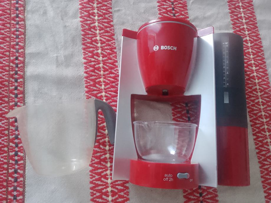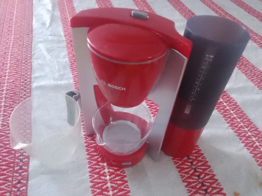 Aparat za kavu za igru Bosch, didaktička igračka. Korišten. Kako nismo imali baterije korišten je bez da se uključi i provjeri kako radi. Pošto se ulijevala voda ne znam bi li sada radio. Dolazi s čašom i još jednim plastičnim vrčem (lijevo na slici) na kojem nedostaje čep gore i napukao je sa strane i zalijepljen selotejpom. Prodajem za 3 eura plus poštarina.