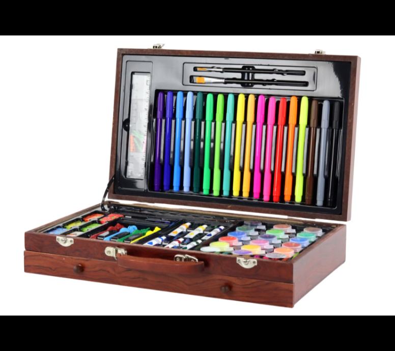 Kada otvorite kovčeg, postajete svjedokom prave simfonije boja i oblika. Pastelne bojice, tri vrste boja, kistovi, flomasteri, ravnalo, spajalice i raznobojne bojice - sve to čeka da bude otkriveno. Čvrsta drvena konstrukcija ne samo da štiti, već i ističe estetiku i vrijednost ovog jedinstvenog kompleta.