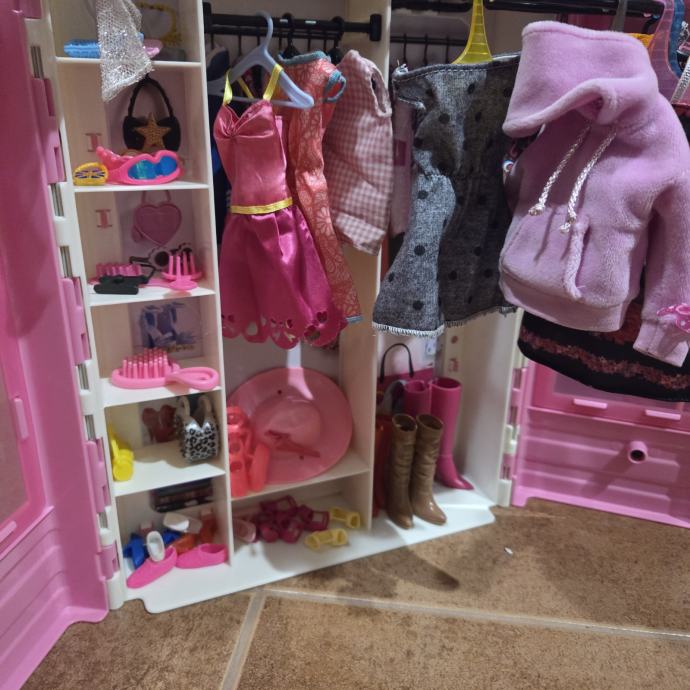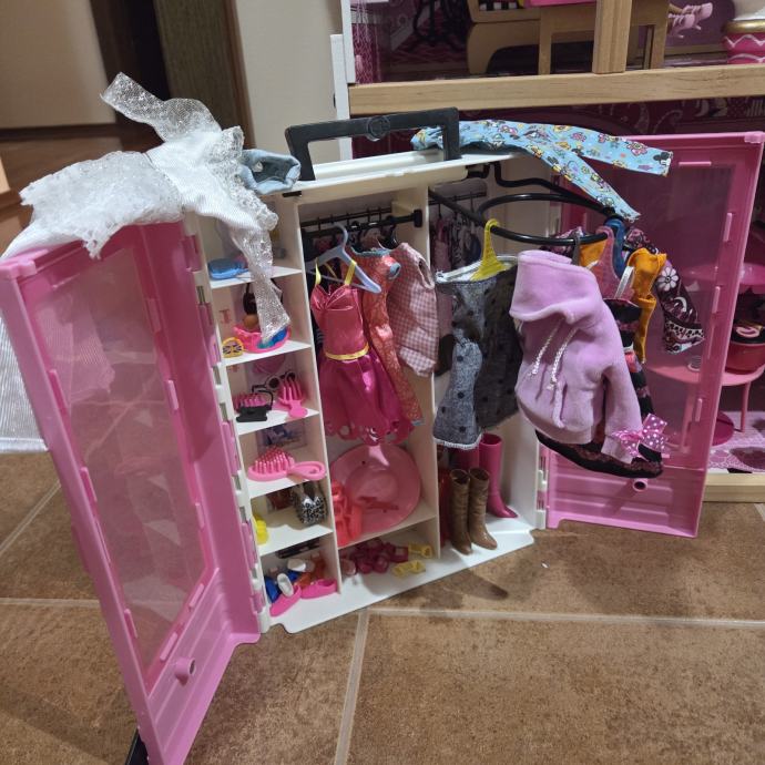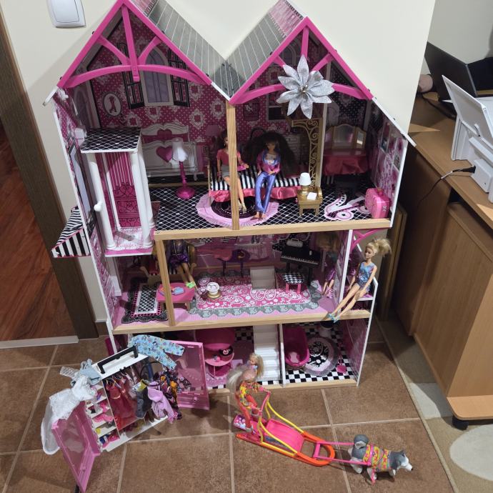 Kidkraft Barbie kuća dužine 90cm, visine 125cm. Uključena sva oprema (svjetiljka, klavir i wc rade na baterije). Uz kuću dolazi Sindy barbie na saonicama i Barbie ormar.