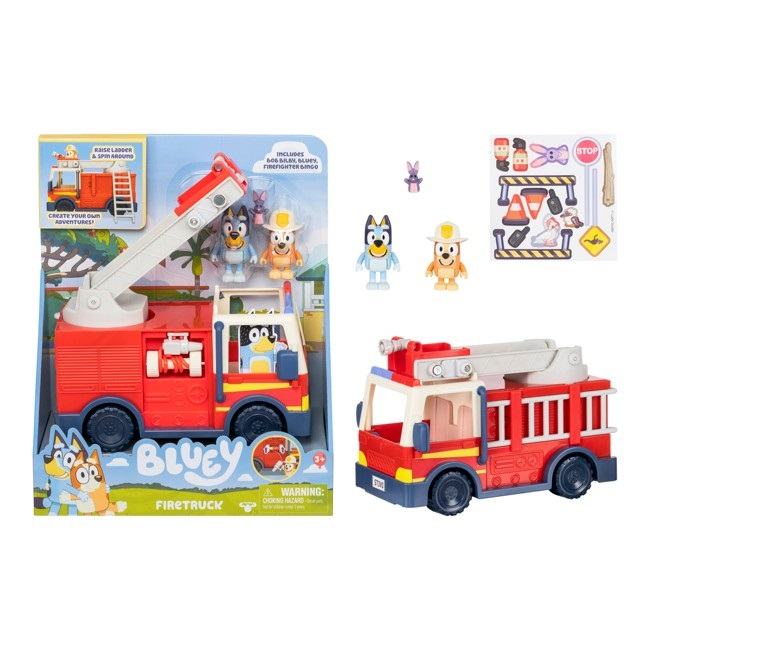 Bluey Firetruck. Feature packed Firetruck with Bluey, Firefighter Bingo and Bob Bilby figures. Raise the ladder, spin it around and pull out the hose. Includes sticker sheet.