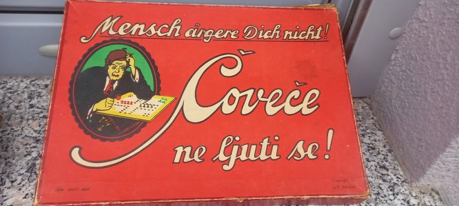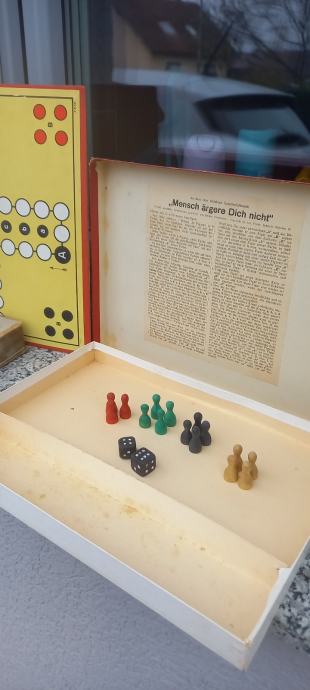 Čovjek se ne ljuti! Stara društvena igra s drvenim figurama i kockom. Razdoblje; ranih 50-ih godina. Nedostaje samo jedna figura, crvene boje.