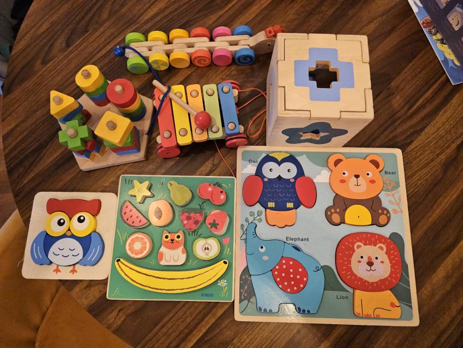 Prodajem set didaktičkih drvenih igrački, pogodno za malu djecu (1-4 godine). Set uključuje: