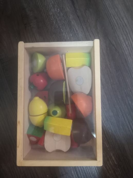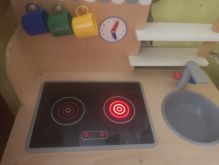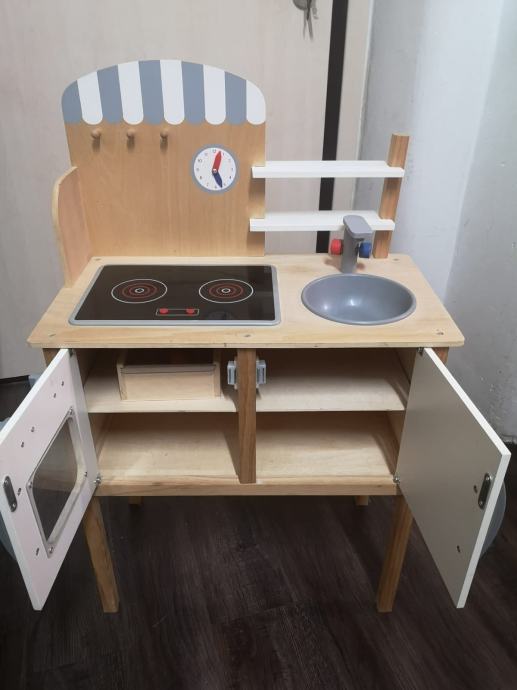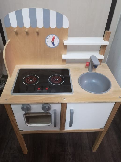 Prodajem dječju kuhinju, drvenu, s dodacima za igru. Ringovi na štednjaku su na baterije pa se mogu paliti i gasiti kao na slici.
