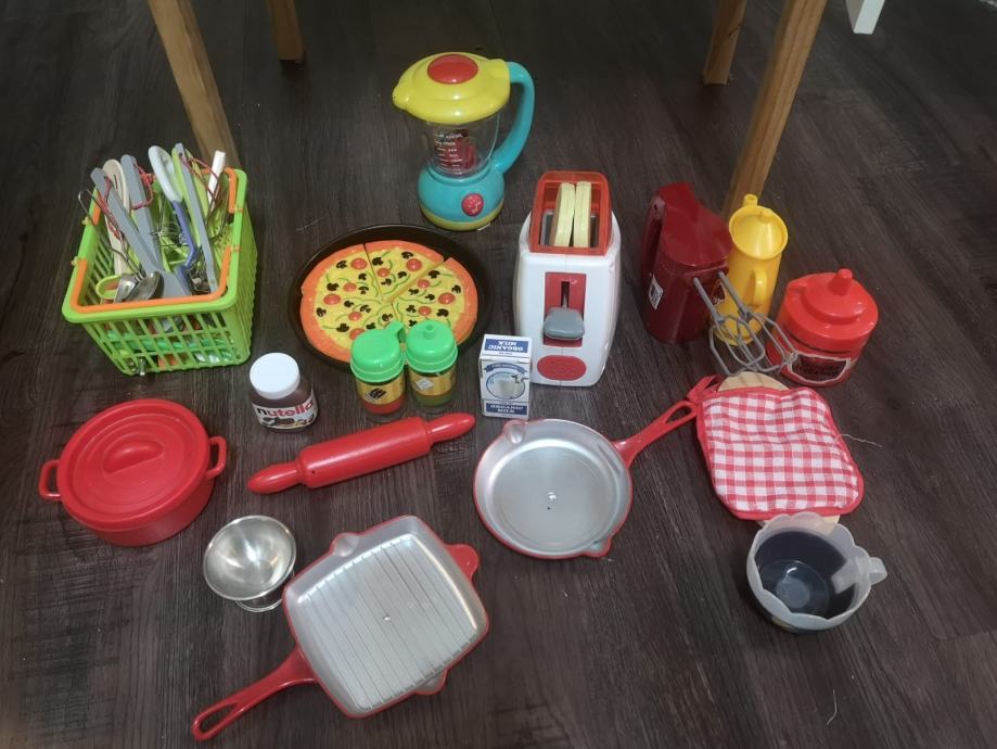 Dodaci za igru uključuju set čajnika, voće i povrće za rezanje, toster, mikser, kuhinjski probor (na slici)