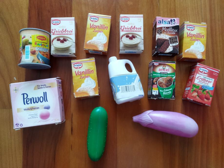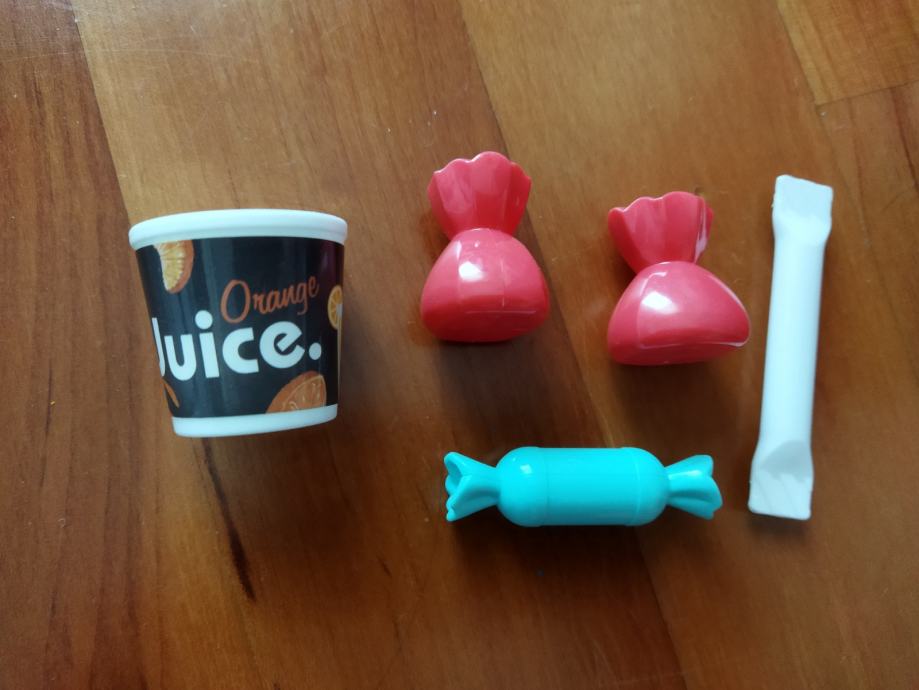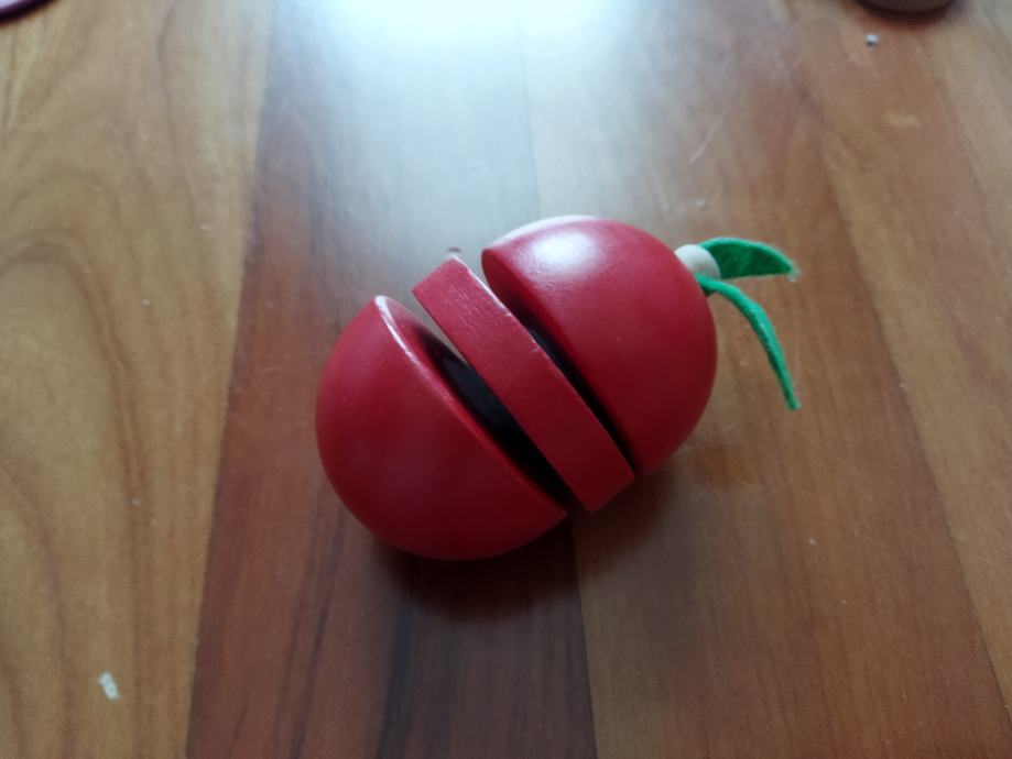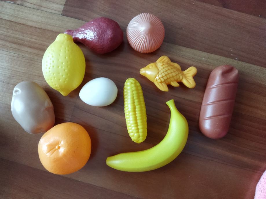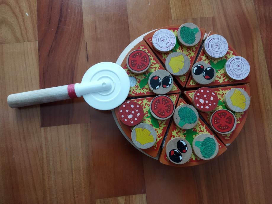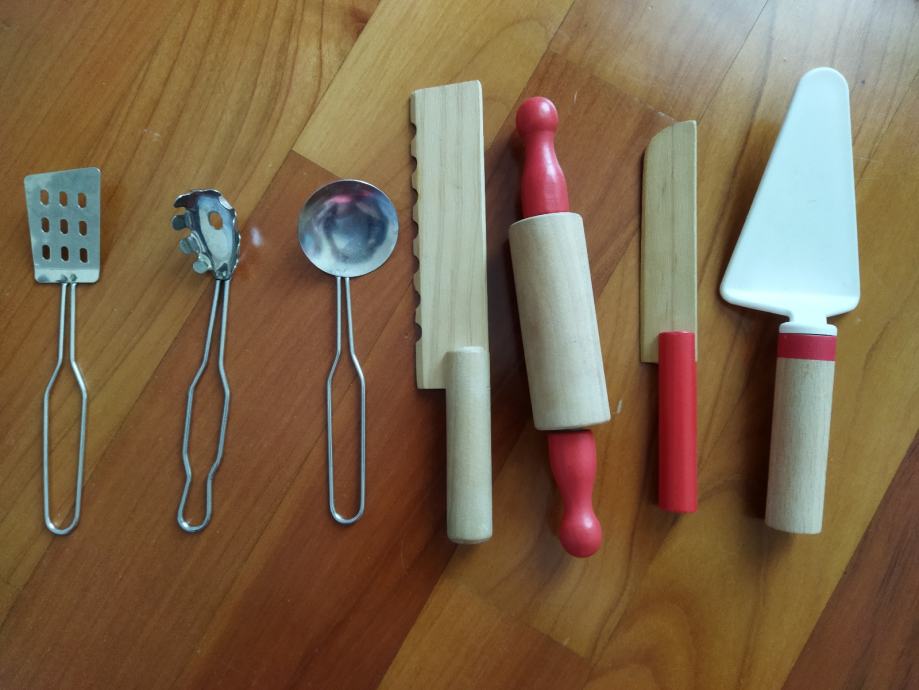 Osim mini posuđa, namirnica, voća i povrća, tu su posebno zanimljive igračke za rezanje - na čičak, a drveni nož je uključen.