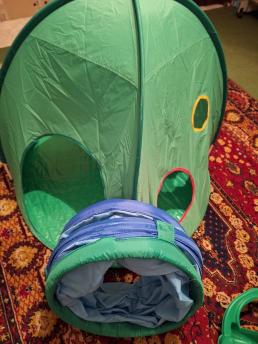 Djecji šator sa tunelom( kupljeno u Ikei pred par mjeseci), dječja guralica traktor te ljuljalica kornjača, žuta mamut stolica iz Ikee, uz to i par flašica za bebe (nekoristene), sve u kompletu prodajem za dijete do 2 godine starosti. Stvari su gotovo nove, malo korištene, beba nam ih je brzo prerasla. Ne šaljem poštom, isključivo osobno preuzimanje, moguća isporuka na području Sesveta.
