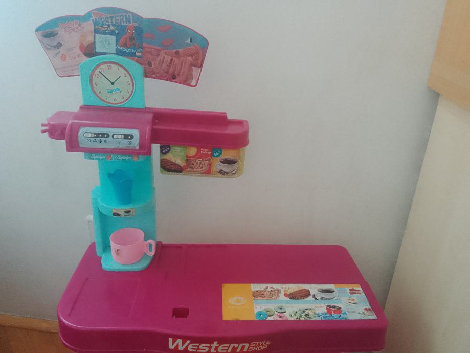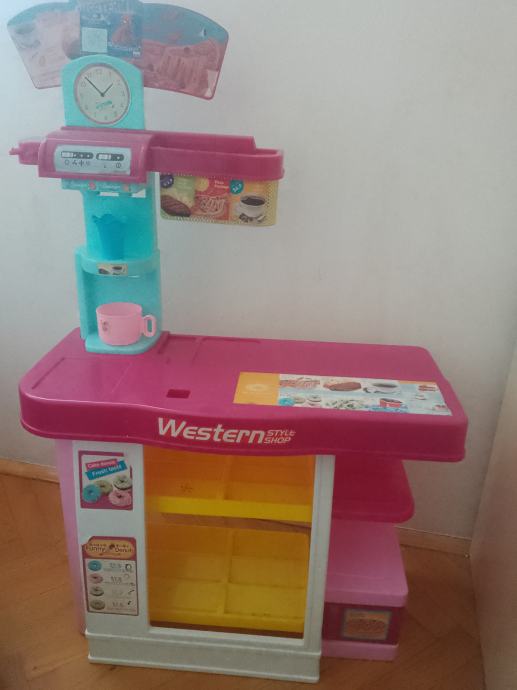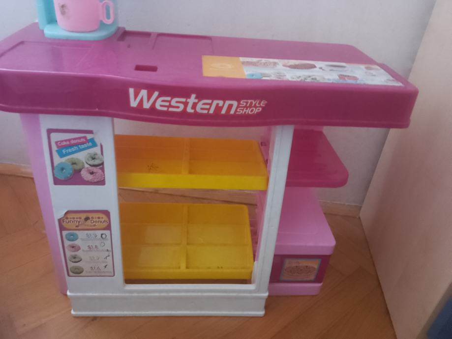 Dječji fast food restoran / dječja trgovina / kuhinja za igru / igračka . Korišteno, očuvano. Na jednoj polici manji trag flomastera. Prodajem jer su moji prerasli. 5 eura.