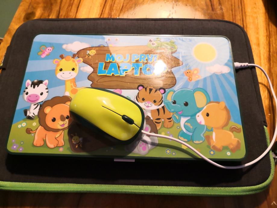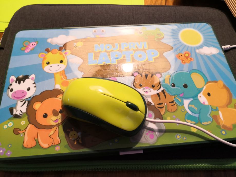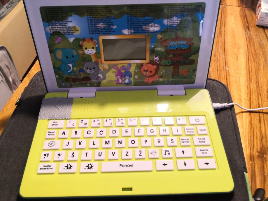 Prodajem igračku dječji "laptop" - Moj prvi laptop. Malo korišten, sve radi ispravno. Srebrni duck tape se može ukloniti (mi smo ga stavili jer i kad se najviše utiša i dalje nam je bio preglasan).