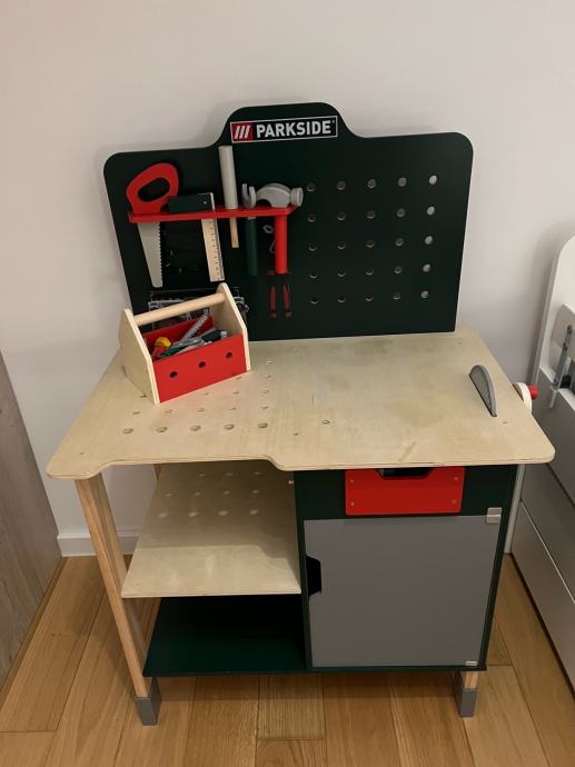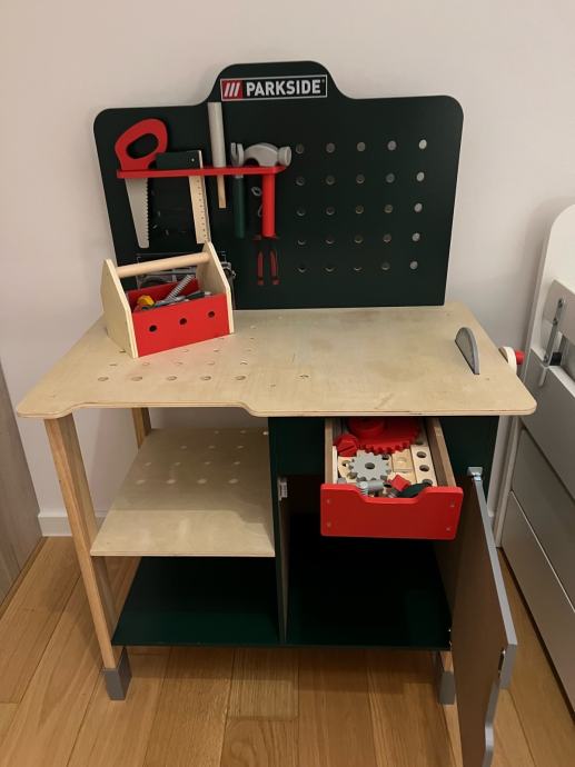 Prodajem dječji stol za alat s Parkside oznakom. Radi se o drvenom radnom stolu u kombinaciji prirodne boje drva, tamno zelene i crvene. Stol ima radnu površinu s rupicama, stražnju ploču za vješanje alata, dvije police ispod radne površine te ladicu i ormarić. U kompletu dolazi i drvena kutija za alat te razni dječji alati kao što su pila, čekić, kliješta, vijci, matice i slični dijelovi.