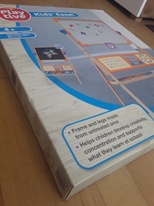 Konstrukcija je široko razmaknuta na nogama, što osigurava stabilnost i sigurnost tijekom igre. Ispod dasaka postavljena je polica na koju će se staviti kreda i spužva. Jedan dio je klasična crna tabla na kojoj se može pisati i crtati priloženim kredama u nekoliko boja. Vrlo lako se spužvicom iz seta ispire s njegove površine.