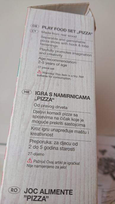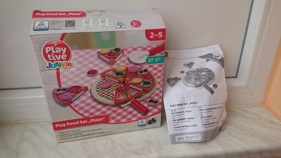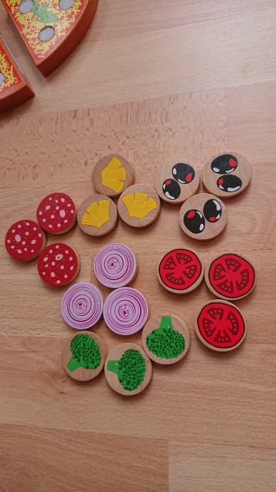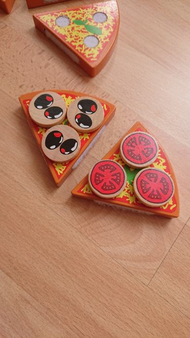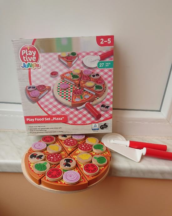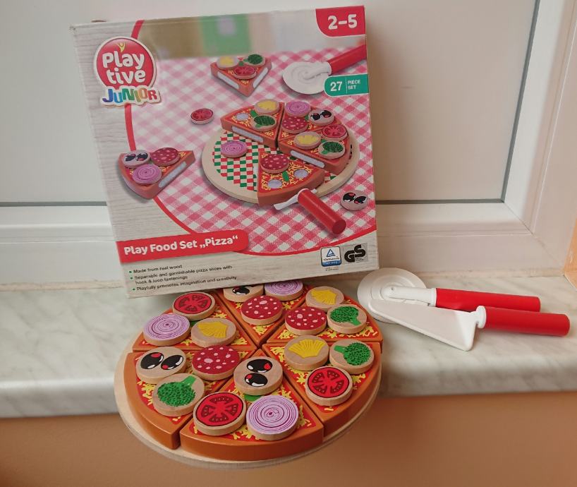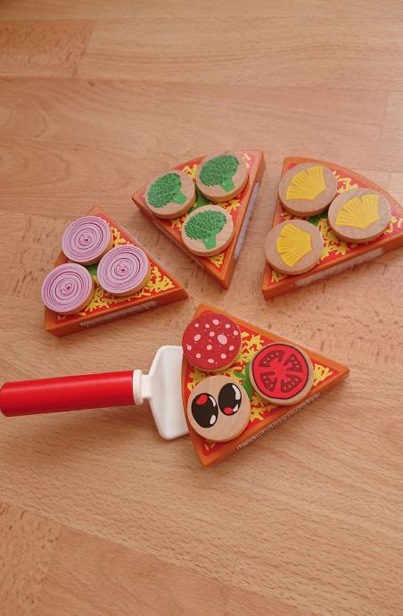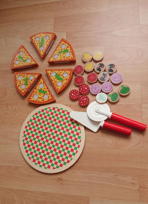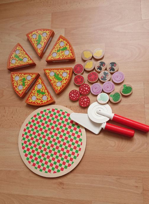 Drvena igračka pizza sa dodacima - dolazi sa tanjurom na kojem se poslužuje pizza, dodacima koji se mogu staviti na svaku krišku, rezalicom i žlicom za držanje kriški.