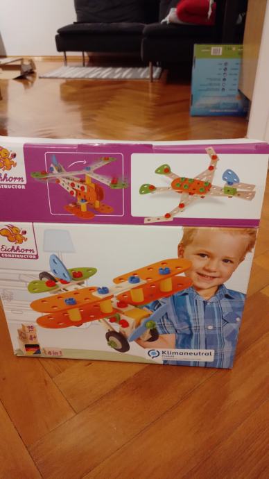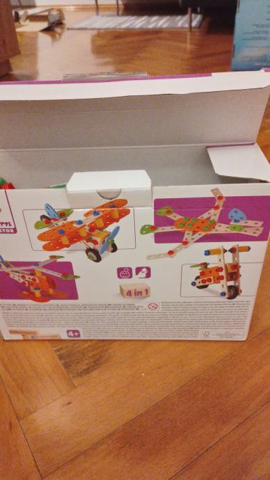 Drvena konstruktor igračka - Eichhorn. Kutija sadrži 90 dijelova iz kojih se mogu složiti 4 različita vozila (kao što se vidi na slici).