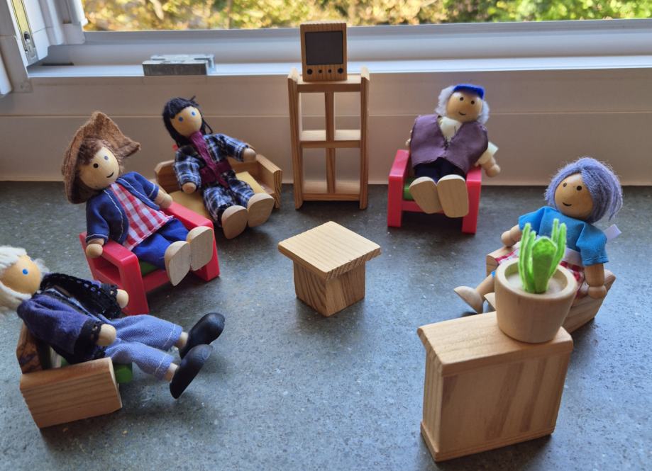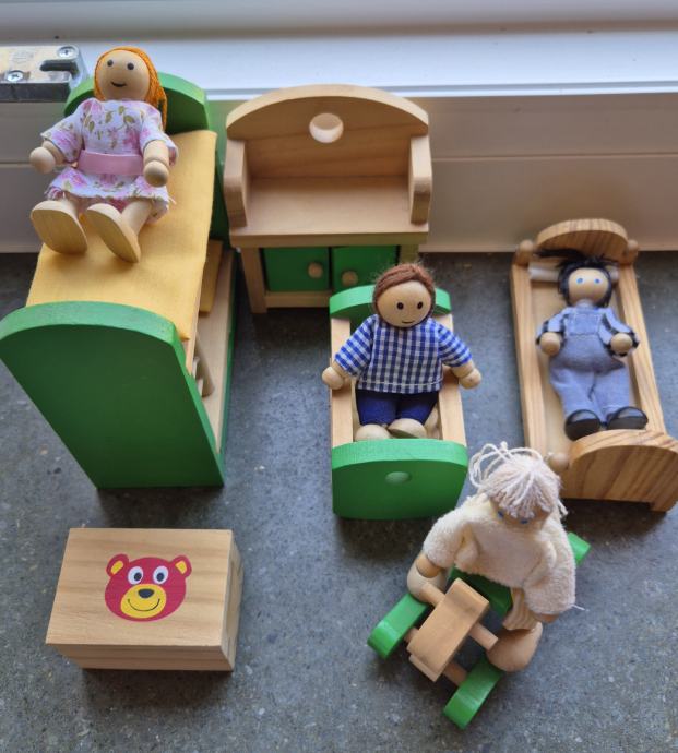 Drvena kućica za lutke 30x40x24cm s pripadajućim najmeštajem (dnevni borovak, 2 spavaće sobe, kuhinja, blagovaona, kupaona, vrt) i lutkicama (9 lutaka).