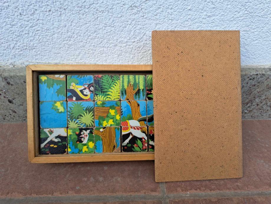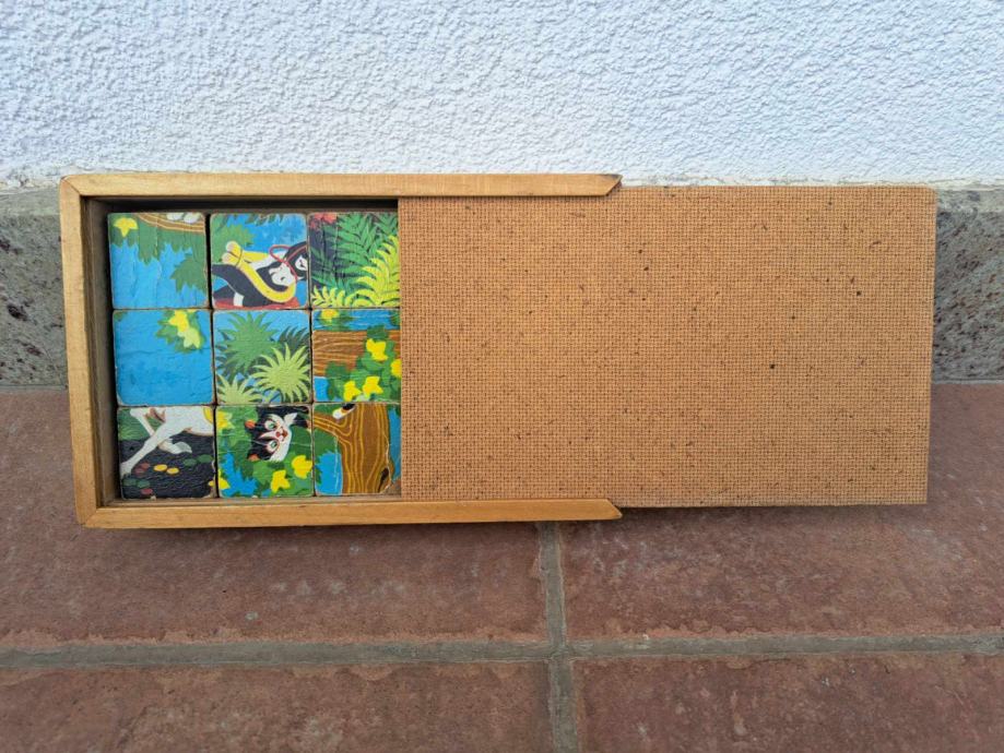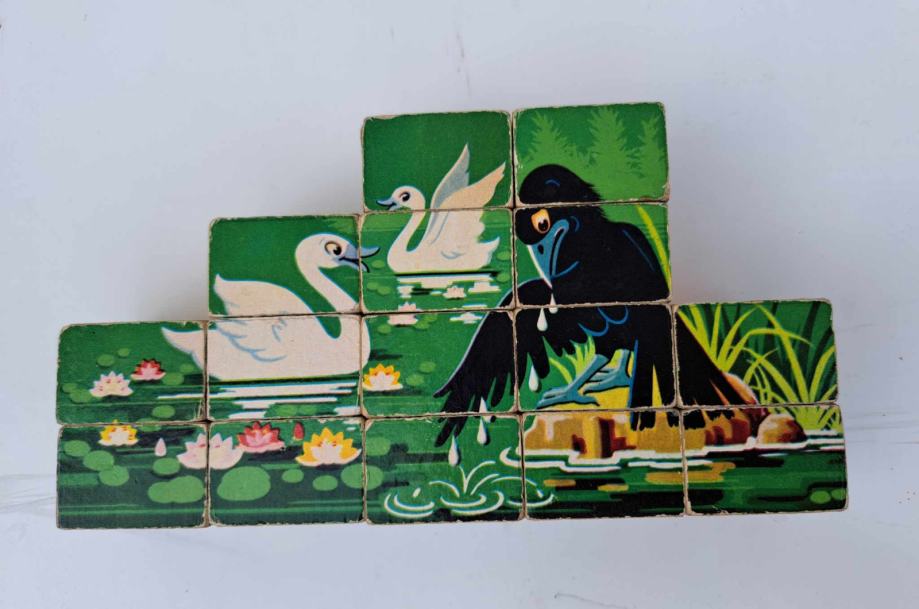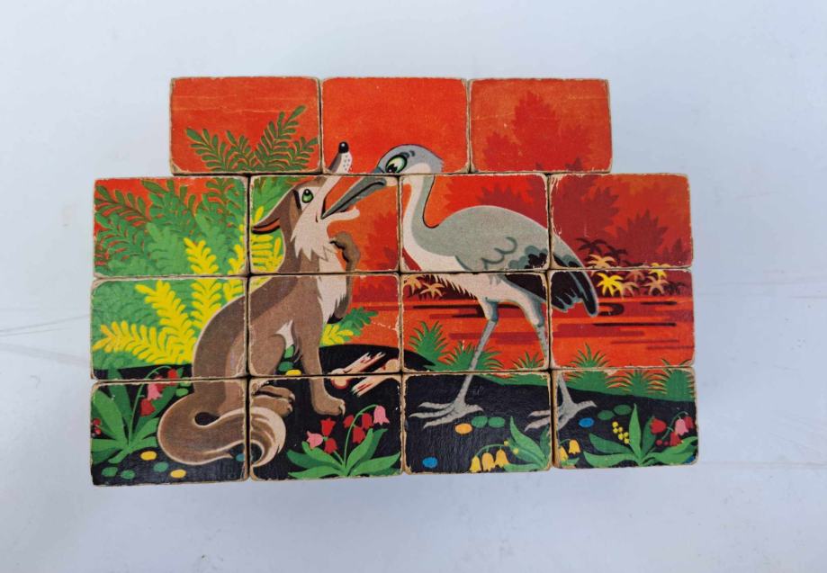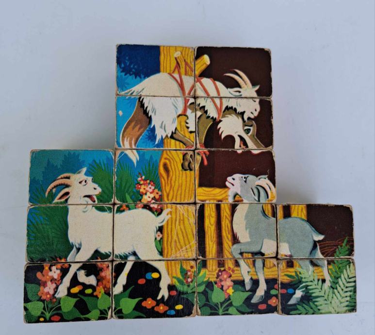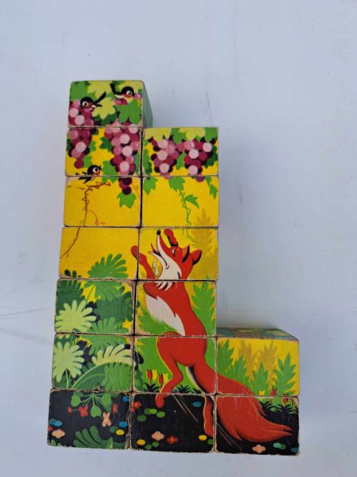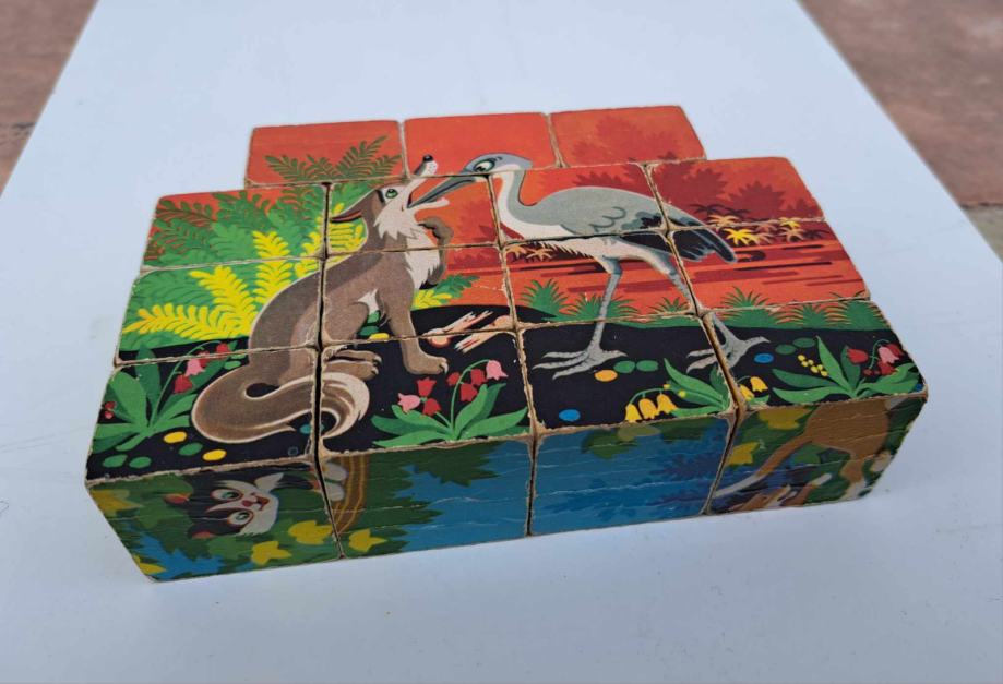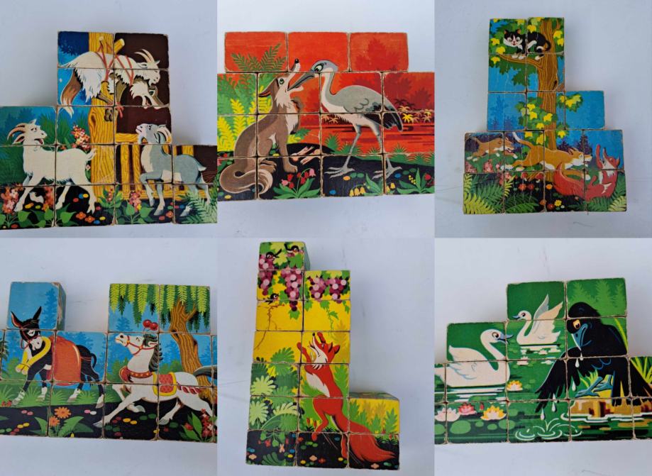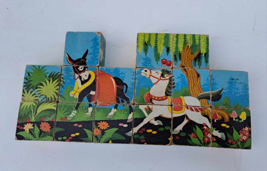 Drvene kocke, točnije, kvadre veličine (37 x 37 x 25 mm) čijim ispravnim slaganjem se prikaže 6 različitih sličica s motivima iz 6 različitih priča ! Obavezno pogledajte fotografije u prilogu ! Navedene 'kocke' nalaze se u prikladnoj drvenoj kutiji s poklopcem !