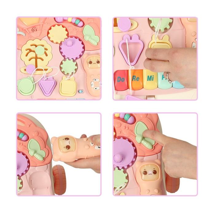 Ploča ima puno različitih, manjih dijelova koji privlače pažnju mališana i potiču ga na igru. Elementi ploče uključuju klavir, perle, plastične zupčanike, stablo labirinta, svjetlo, oblike sa slovima ABC i mobilni telefon s glazbom.
