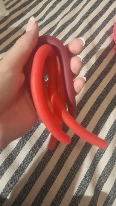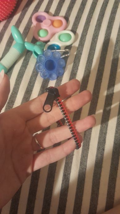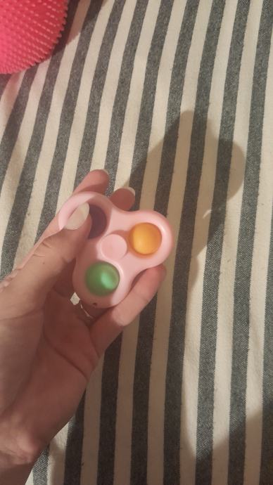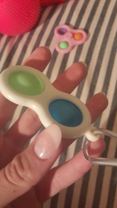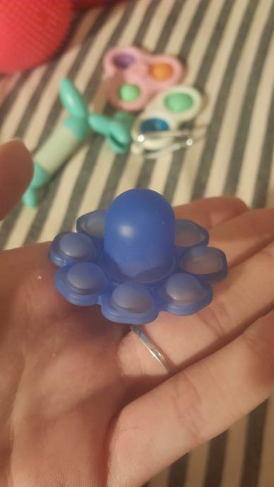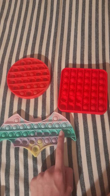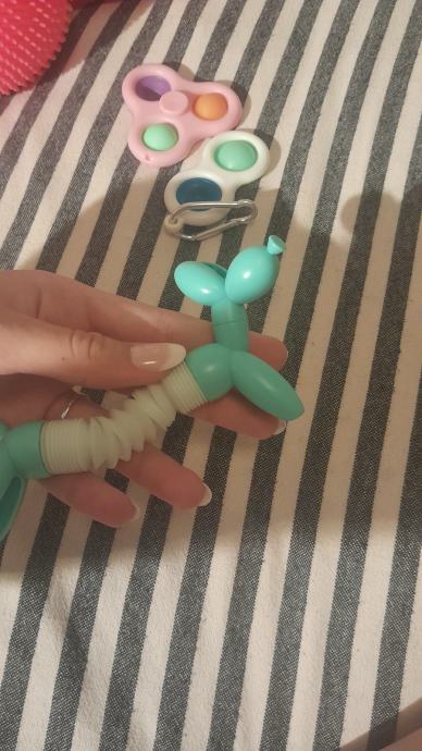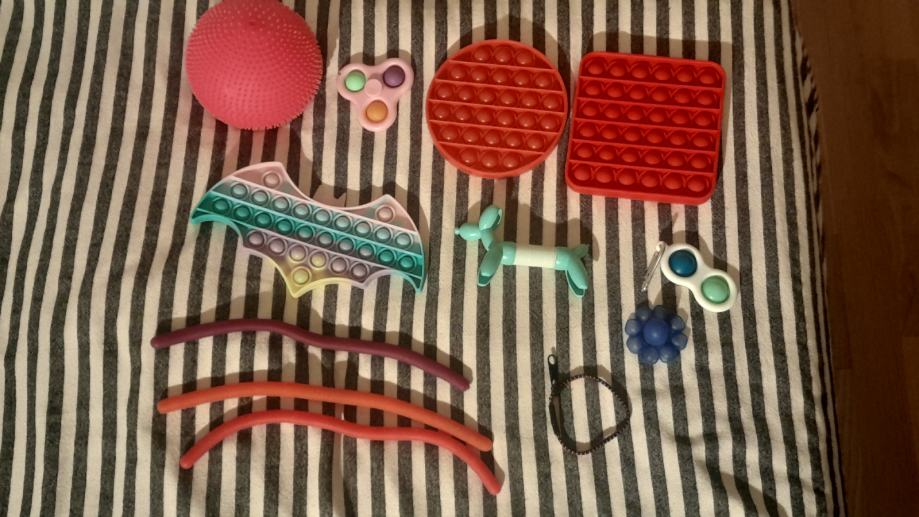 Fidget toys paket sastoji se od 3 srednja pop it-a, jedne velike stress-ball, jedne male pop tube, simple dimple (rabljen), mini hobotnica pop it, 3 monkey noodlesa, jedne fidget narukvice i jedan pop it fidget spiner. Stvari su kupljene u periodu od godinu dana. Plavo-zeleni simple dimple je rabljen kao i ljubičasti monkey noodle i roza stress-ball.