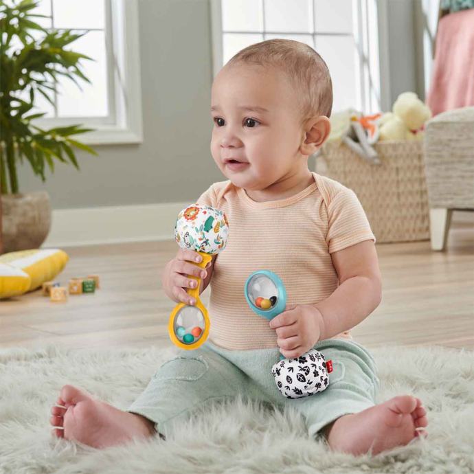 Fisher-Price Rock 'n Rattle Maracas savršene su za bebe, s mekanim pomponima i šarenim perlicama koje stvaraju zabavne zvukove. Visokokontrastni uzorci, boje i teksture stimuliraju osjetila, dok drmanje i zveckanje jačaju motoričke sposobnosti. Idealne za igru i razvoj!