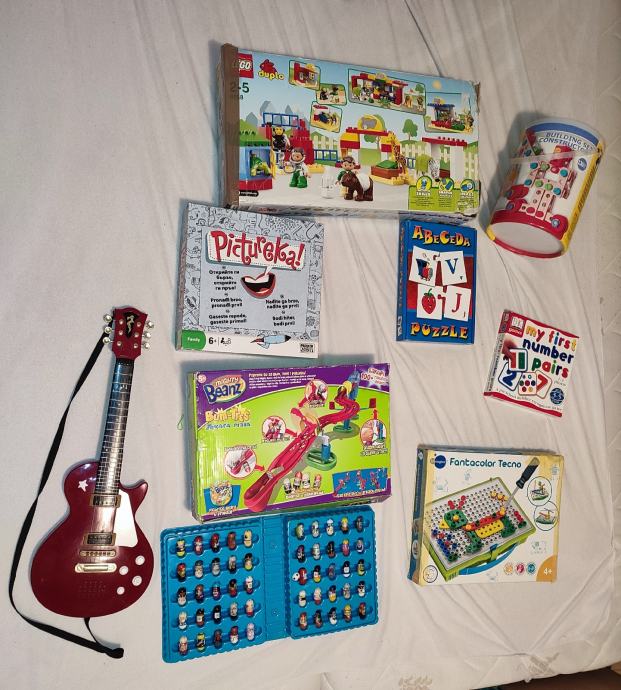 Gitara na baterije prodana. Edukativne igre slova (jednom složeno) i brojevi, igra Tko je to (nikad igrano)... po 4 EUR.