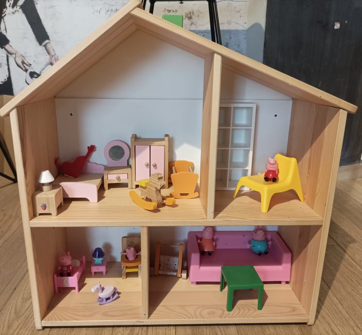 Prodajem Ikea kućicu za lutke zajedno s Ikea namještajem, dodatnim drvenim namještajem, namještajem Peppa pig te figuricama iz crtića.