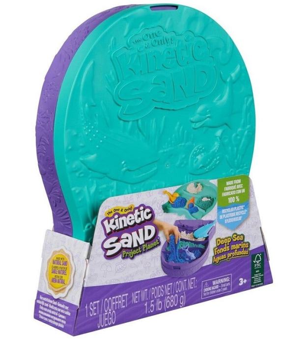 Istražite dubine oceana uz kinetic Sand Project Planet Deep Sea komplet za igru. Kopajte i grabite svaku razinu pijeska školjkom kako biste otkrili morsko stvorenje. Set dolazi s pijeskom plave, plavozelene i bijele boje, 4 alata i obrazovnom karticom. Nakon igre sve spremite u spremnik radi lakšeg spremanja. Set sadrži: 680 g kinetičkog pijeska, 1 spremnik s poklopcem, 1 lopaticu/kalup za raže, 1 rezač/kalup za delfine, 1 ribež za kitove morske pse, 1 lopaticu za školjke, 1 eko-info karticu. Dob: 3+