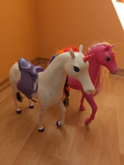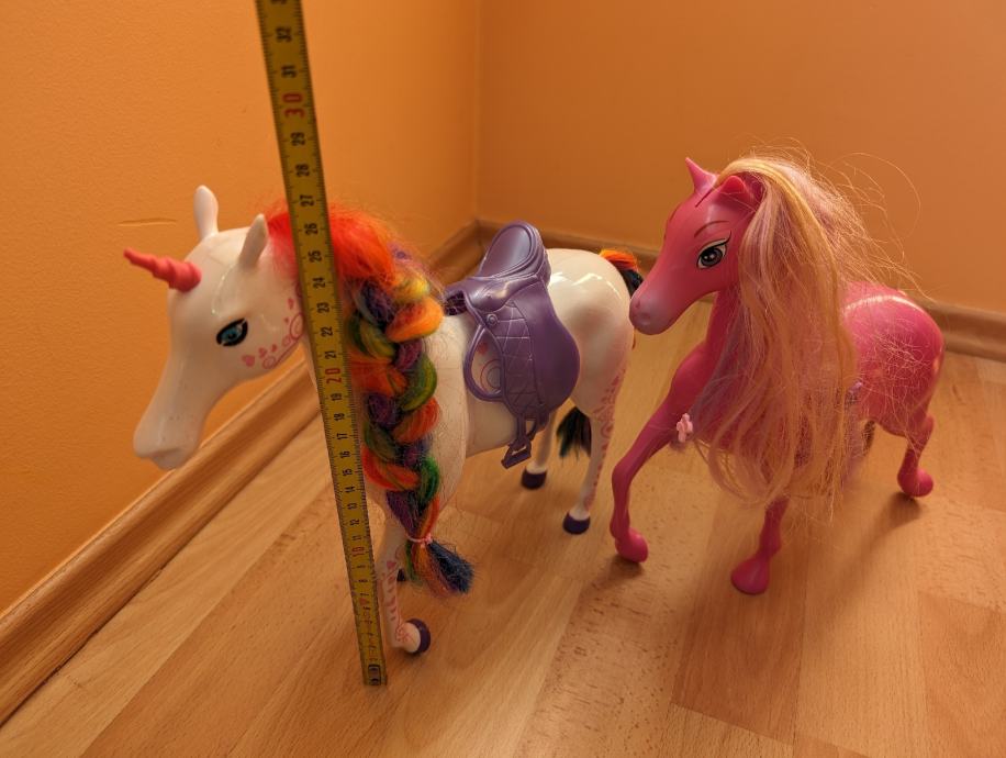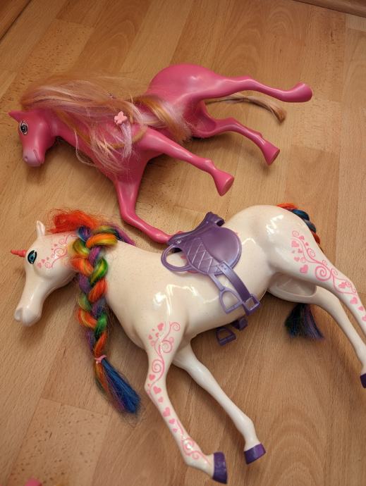 Konji i kočije igračke za djevojčice - bijeli jednorog s grivom u duginim bojama i sedlom, rozi konj s dodacima za kosu, ljubičasti konj, kočija, sedlo, dekica i tri Safiras kočije od Safiras zmajeva. Dimenzije su uslikane.