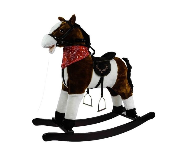 Konjić na ljuljanje tamno smeđi napravljen je od mekanog pliša. Ima drvene ručke, udobno sjedalo sa stremenima.