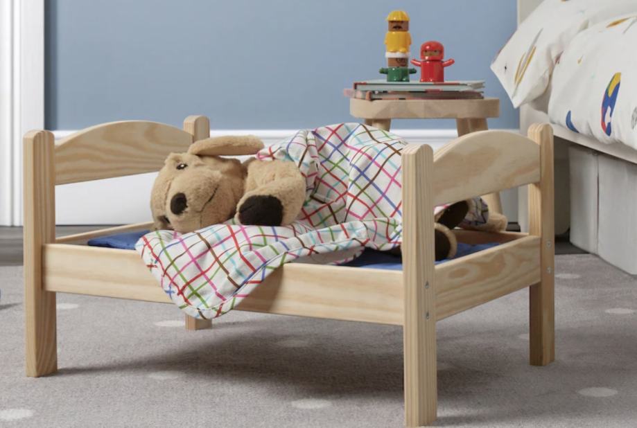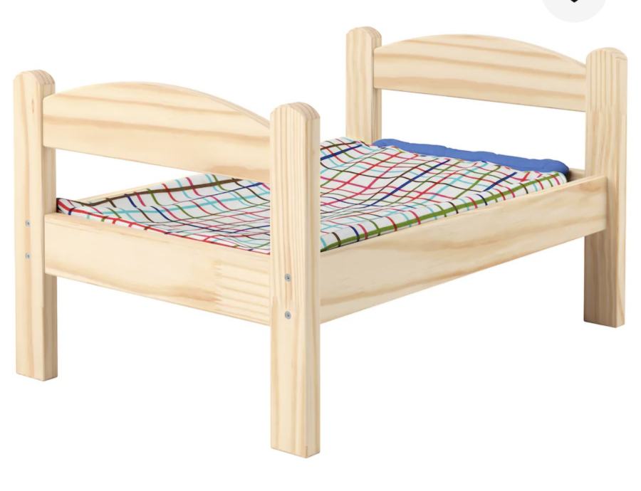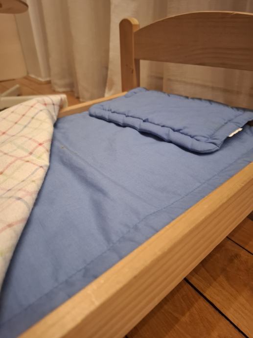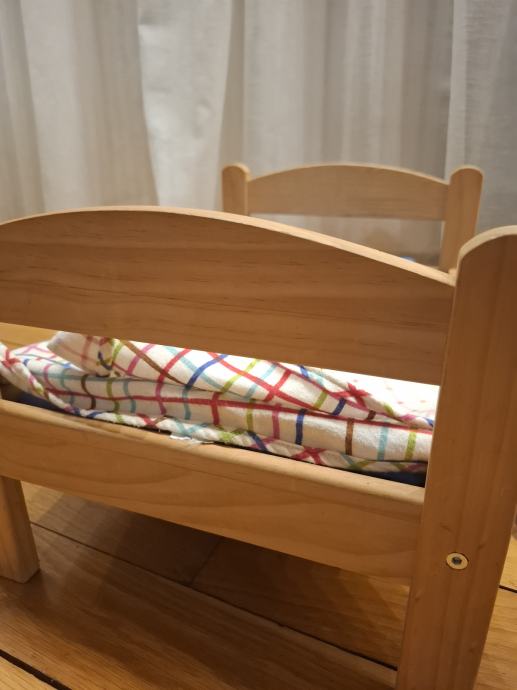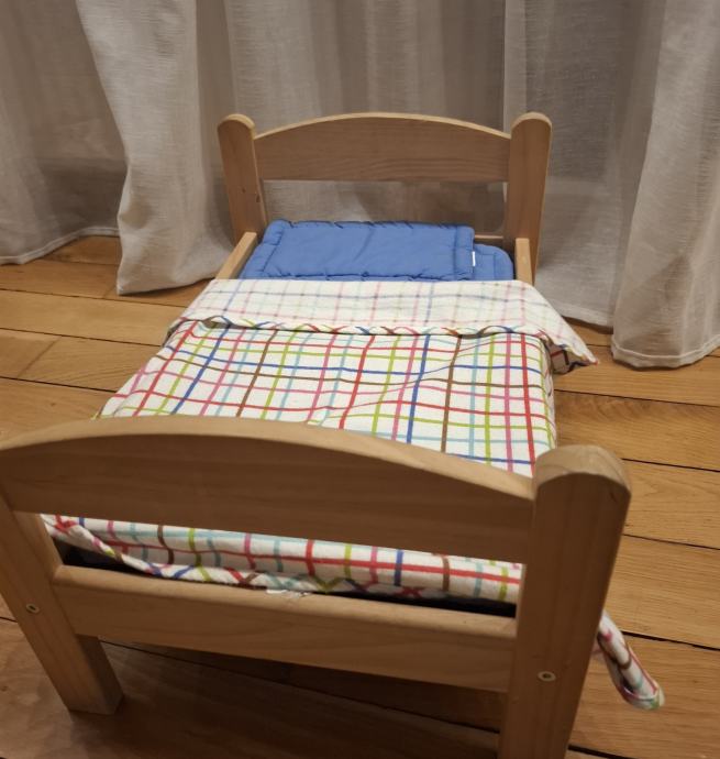 Veliki krevet za lutke IKEA, od drva, sa posteljinom. Očuvan, čvrst i kvalitetan. Dužina 51,5 cm