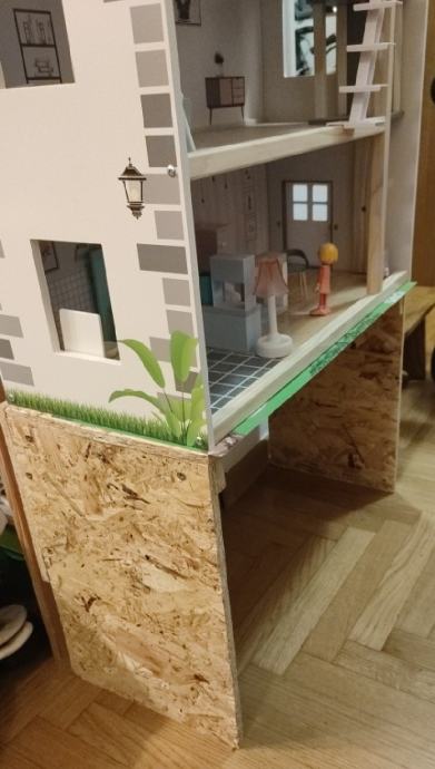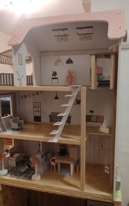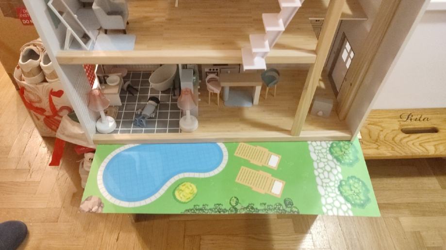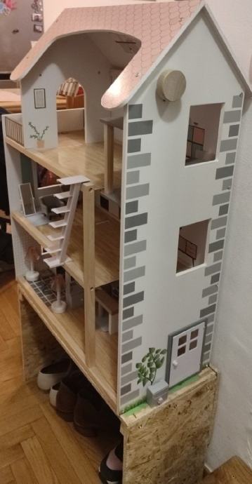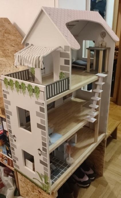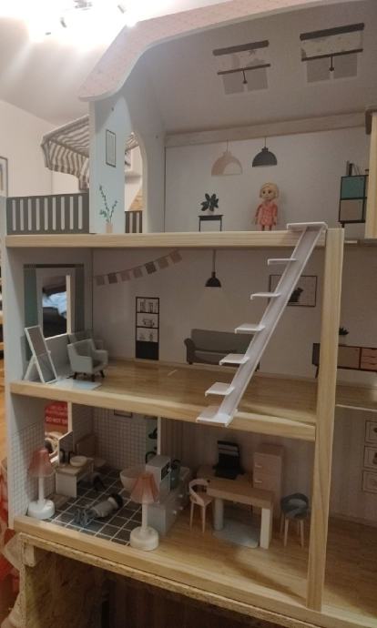 Prodaje se kuća za lutke, potpuno očuvana, s pripadajućim namještajem. Dodatno je napravljena "klupa" visine 40cm, za lakšu igru.