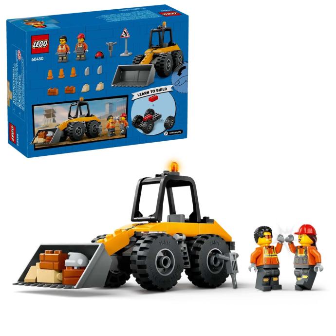 Pripremi se za akciju uz LEGO City Žuti građevinski utovarivač s kotačima. Odlični stroj ima veliku žlicu za utovar i čvrste gume za vožnju po neravnom terenu. Označi radno područje znakom i čunjevima, stavi štitnike za uši pa razbij beton pneumatskom bušilicom. Uskoči u vozačku kabinu, kontroliraj snažni stroj i zabavi se!