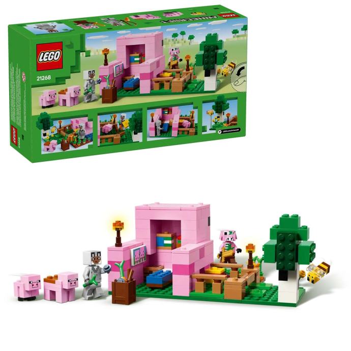Navuci vučju masku, osedlaj svinju, stavi mrkvu na štap i jaši po kući i vrtu u obliku male svinje. Provjeri kako raste krumpir i repa pa povedi malu svinju kroz vrata u polje. Ako ti zombificirana svinja zasmeta, uđi u kuću , gdje se nalaze krevet, polica za knjige i stol za izradu koji potiču maštovitu igru. Smještena u šumski biom Minecrafta, ova kreativna igračka za gradnju kuće uključuje mnoge figure iz popularne videoigre: heroj u koži vuka, bebu svinje, pčelu, odraslu svinju i zombificiranog prasca.