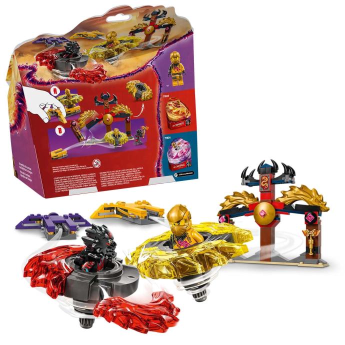 U setu: Lego kocke za gradnju hrama borbene arene i scene iz 3. sezone NINJAGO Dragons Rising TV showa, 2 mini-figure: ninja Arin s mačem, zlikovac Rasa s mačem, 2 zmajeve spinjitzu igračke.