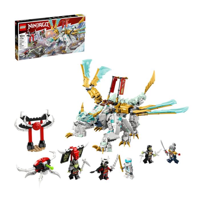 Spusti se s neba sa Zaneom i njegovim sjajnim ledenim zmajem pa se suoči s 3 zla kosturska ratnika. Napadni zmajevim oštrim ledenim kandžama, rogovima, repom i ledenim dahom! Kada pobijediš u dvoboju, pretvori model u silnog zmajskog ratnika na 2 noge s velikom zlatnom oštricom. Možeš birati između 2 stvorenja spremna za bitku da zaštitiš grad NINJAGO od napada!
