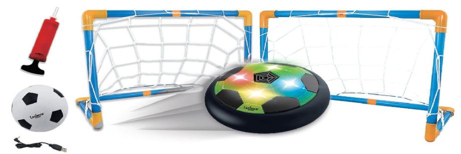 * Super dynamic hovercraft effect! Air escapes from the disc, offers fast and thrilling games!* Easily slides on every flat surface.* Shockproof foam edges to protect your walls and furniture.* Coloured light effects to play even in the dark.* Hovercraft effectIncludes:2 goals: easy to mount and convenient to carry everywhere!Sliding foot diskinfatable ballpump